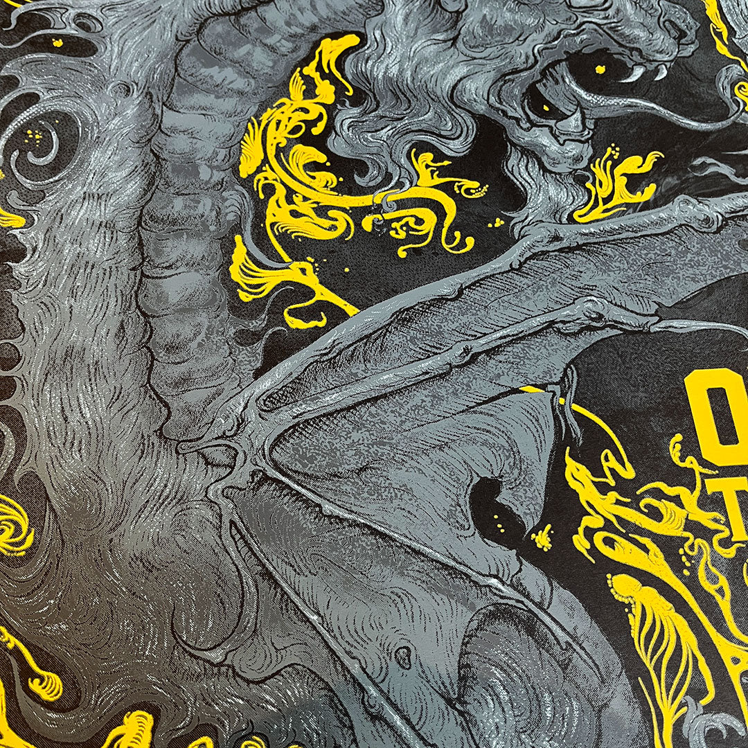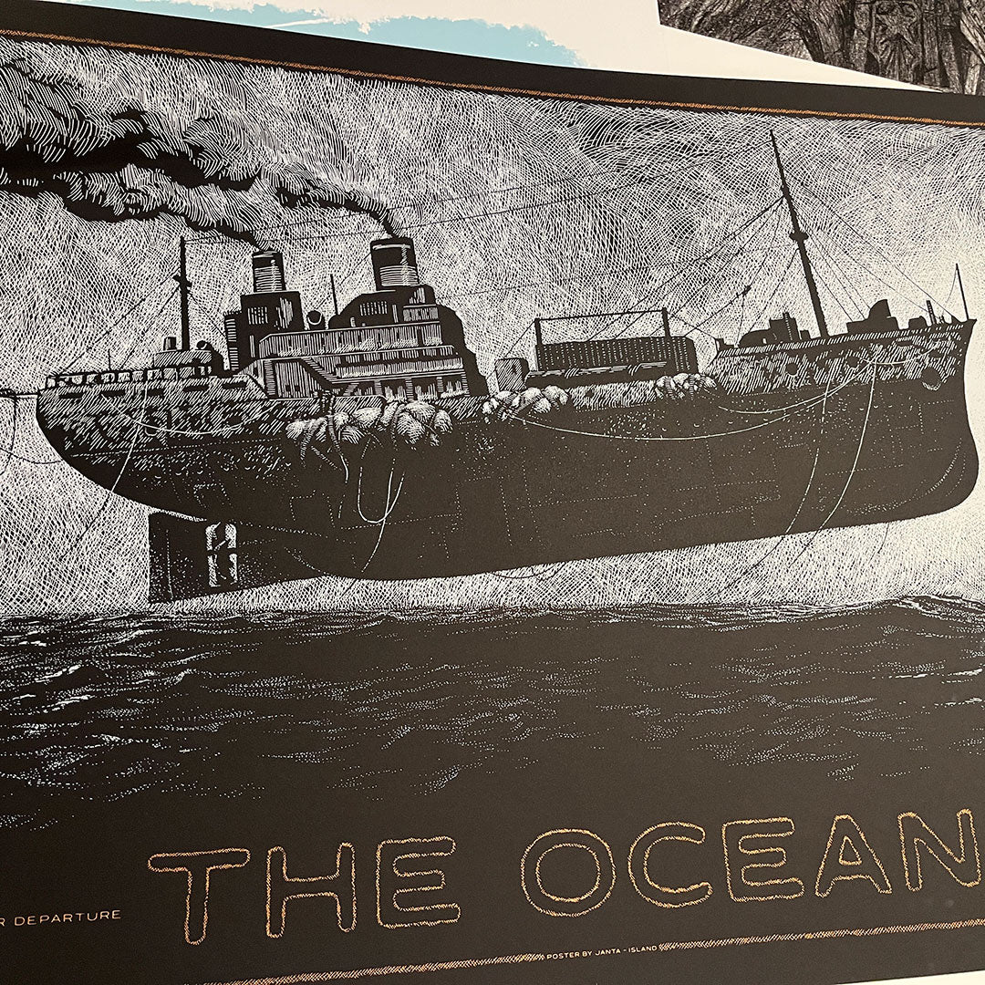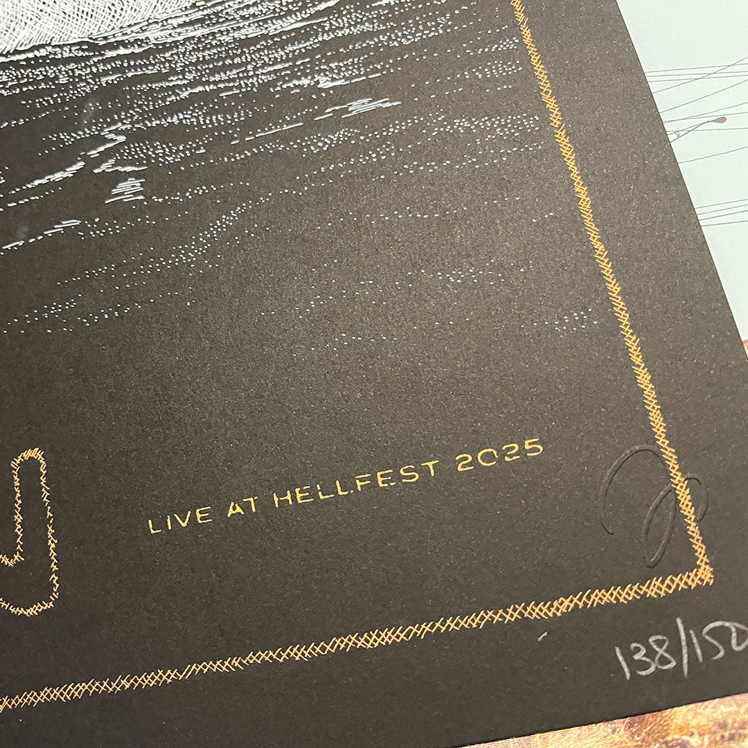 The Ocean | Hellfest 2025 Sérigraphie officielle | Concert de Clisson 21.6.25 Design et gravure de Phillip Janta. Sérigraphie 2 couleurs (blanc et bronze) Edition limitée signée de 150 ex (AP).... Voir la description complète du produit