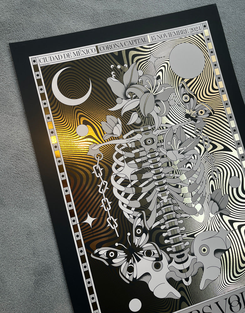The Mars Volta | Ciudad de México Sérigraphie officielle - sur papier Foil doré Concert au Corona Festival, Mexique, 15.11.2024 Design de l'artiste Tone Olvera Edition limitée signée de 100 exemplaires... Voir la description complète du produit
